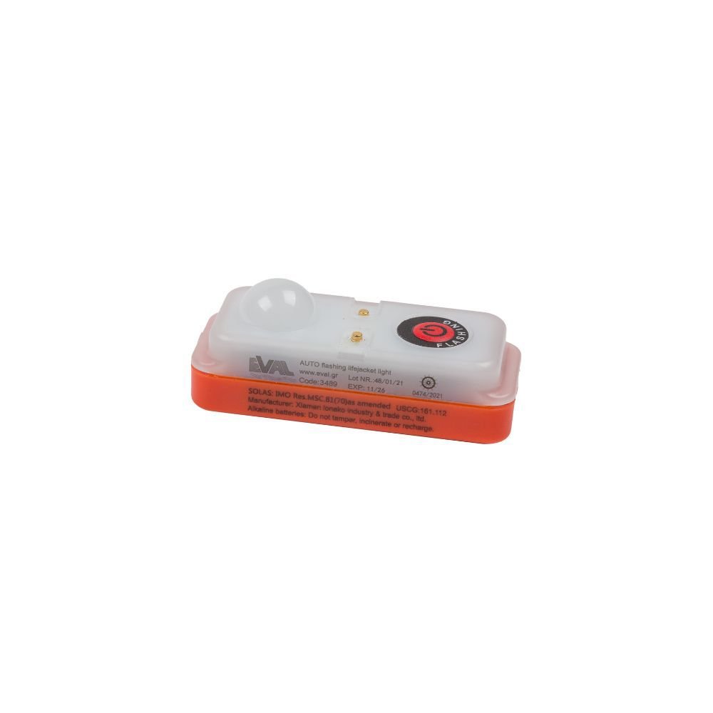 Ο φανός σωσιβίου EVAL LED με αλκαλικές μπαταρίες ενεργοποιείται αυτόματα μόνο με επαφή με το νερό, πλεονέκτημα έναντι της ακούσιας χειροκίνητης ενεργοποίησης. Απενεργοποιείται χειροκίνητα. Έχει διάρκεια ζωής 5 χρόνια και εγγυάται συνεχή λειτουργία για περισσότερες από 8 ώρες. Η απόδοσή του σε ένταση και διάρκεια ξεπερνά σημαντικά τις ελάχιστες απαιτήσεις. Ο σχεδιασμός του είναι συμπαγής και στιβαρός. Οι αλκαλικές μπαταρίες είναι φιλικές προς το περιβάλλον και μειώνουν το κόστος μεταφοράς. Το προϊόν παρέχεται με κλιπ για τοποθέτηση σε ιμάντες σωσίβιου.
